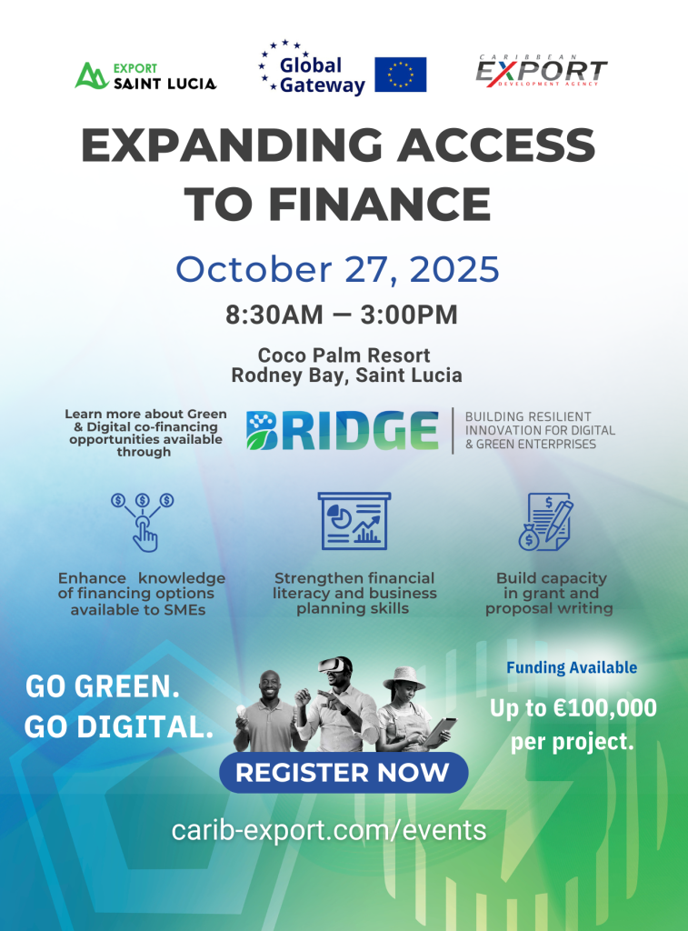 The workshop will also introduce the Building Resilient Innovation for Digital & Green Enterprises (BRIDGE) programme — an initiative of Caribbean Export, supported by the European Union’s Global Gateway. Through BRIDGE, Caribbean businesses can access co-financing of up to EUR 100,000 to accelerate their green transition and digital transformation.