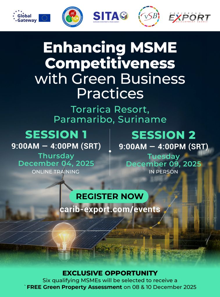 Enhancing MSME Competitiveness with Green Business Practices is a renewable energy training series that forms a key part of a broader programme focused on strengthening the competitiveness of the CARIFORUM private sector through sustainable energy adoption. The sessions are crafted to provide businesses with hands-on guidance and practical tools to introduce green energy solutions, improve energy efficiency, and lower operational expenses. Six MSMEs are also selected to receive a free green property assessment.