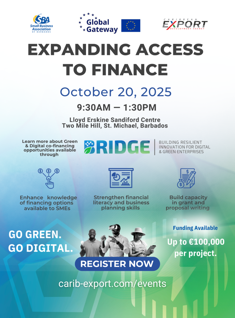 The workshop will also introduce the Building Resilient Innovation for Digital & Green Enterprises (BRIDGE) programme — an initiative of Caribbean Export, supported by the European Union’s Global Gateway. Through BRIDGE, Caribbean businesses can access co-financing of up to EUR 100,000 to accelerate their green transition and digital transformation.