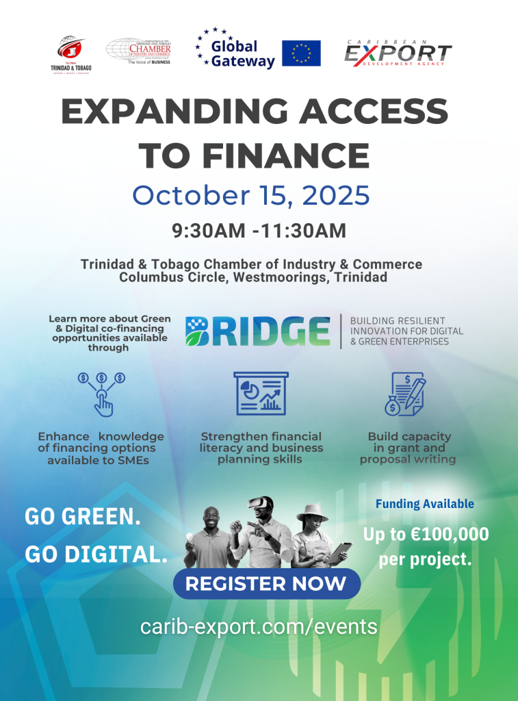 The workshop will also introduce the Building Resilient Innovation for Digital & Green Enterprises (BRIDGE) programme — an initiative of Caribbean Export, supported by the European Union’s Global Gateway. Through BRIDGE, Caribbean businesses can access co-financing of up to EUR 100,000 to accelerate their green transition and digital transformation.
