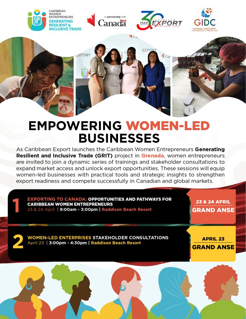 As part of the GRIT Project’s activation in Grenada, women entrepreneurs are invited to join a series of expert-led workshops and stakeholder consultations, scheduled for April 22–24, 2026. These sessions will equip women-led businesses with practical tools and strategic insights to strengthen export readiness and compete successfully in Canadian and global markets.