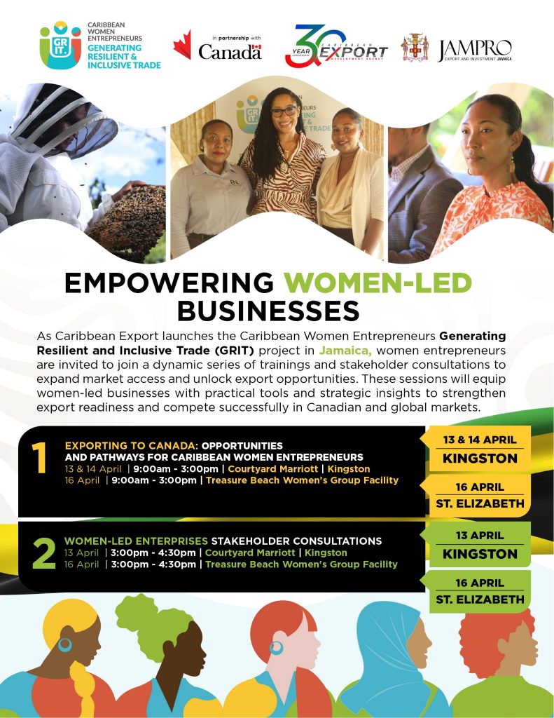 As part of the GRIT Project’s activation in Jamaica, women entrepreneurs are invited to join a series of expert-led workshops and stakeholder consultations, scheduled for April 13–17, 2026. These sessions will equip women-led businesses with practical tools and strategic insights to strengthen export readiness and compete successfully in Canadian and global markets.